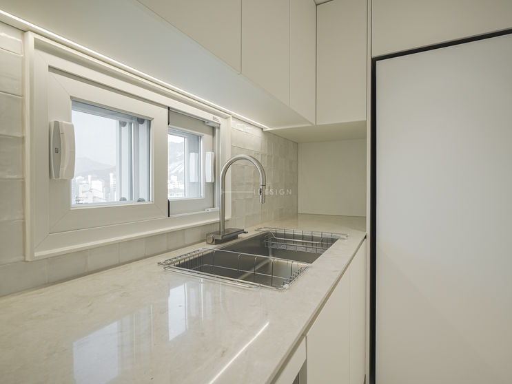 주방은 디귿자 구조로 수납과 동선을 효율적으로 구성하고, 안방은 결로 방지를 고려한 붙박이장 배치로 실용성을 강화했습니다.