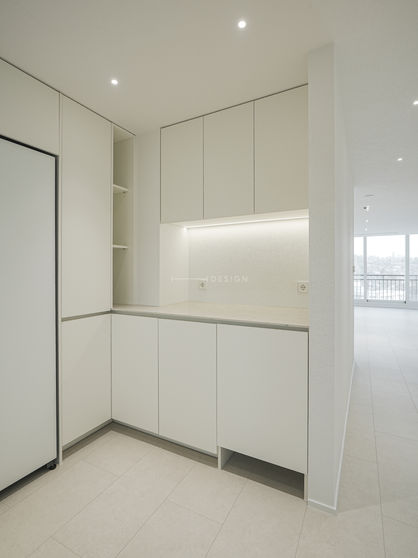 현관은 크림화이트와 테라조 타일로 깔끔하게 정리했으며, 프레임리스 자동 유리중문으로 미니멀한 라인을 완성했습니다.