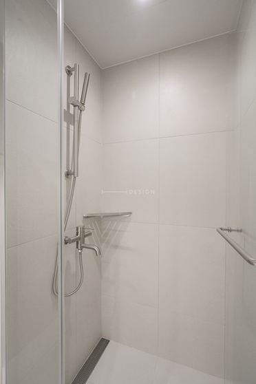거실 기둥은 디자인 포인트로 활용했고, 내력벽을 활용한 홈바를 설했습니다. 비좁았던 주방은 레이아웃 변경과 보조 공간 확장으로 넓고 쾌적하게 완성했어요.